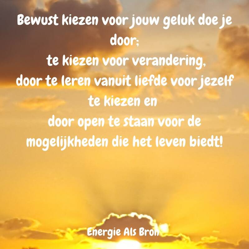 Wanneer jij door het bovenstaande gaat geloven en vertrouwen in jezelf kan je met jouw energie gaan sturen en creëren. Alles waar jij je je aandacht op richt groeit. Wil je dus iets bereiken zal je moeten geloven en vertrouwen in wat je kan en zal krijgen. Door jouw focus, jouw energie, ontstaan er kansen en mogelijkheden en doordat je bewust leeft zal je de kansen en mogelijkheden herkennen die op je pad komen. Het enige wat je dan nog hoeft te doen is die kansen aanpakken want, vergeet niet, voor al het bovenstaande is actie nodig. Niets gaat vanzelf! Wil jij het anders dan mag je bewust gaan kiezen voor verandering en je daar voor gaan inzetten!